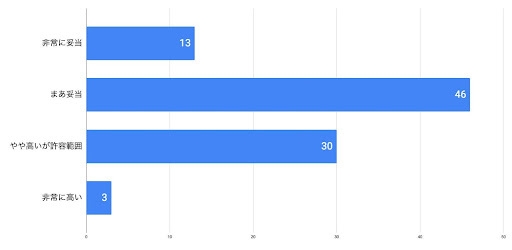 光回線10Gbpsプランの月額料金に関する満足度調査を行った結果、妥当もしくはやや高いが許容範囲と回答したユーザーが多かったです。