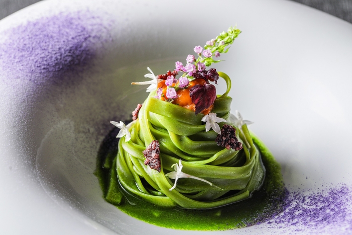 雲丹と小松菜のタリアテッレ 魚介のブロード エストラゴンと紫蘇のアクセント