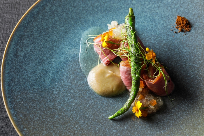 イタリアンをベースに、四季を感じる繊細な和の素材をアレンジし、アーティスティックに仕上げた“イタリアンキュイジーヌ”。レストラン料理長の德永悟朗が盛り付けの造形美をイメージしながらメニューを開発。幅広い世代に美味しく味わっていただけるよう、イタリアンをベースにしながら和の食材を織り交ぜ、素材を活かした味付けにハーブや香辛料を使い食べ飽きないコースメニューに。ファーストディッシュの“夏畑2021 旬菜のバーニャカウダ”は遊び心を取り入れた一皿。甘味、苦み、酸味、旨味、塩味を効かせた五味で味わうシェフのスペシャリテ“赤海老とピンクグレープフルーツのタルタル”や鮮やかなグリーンカラーの小松菜のタリアテッレなど夏らしいビタミンカラーのお料理は目でも舌でもお楽しみいただけます。大人な隠れ家的なレストランで極上のお料理とともに日常の喧騒を忘れられるひと時をお過ごしいただけます。