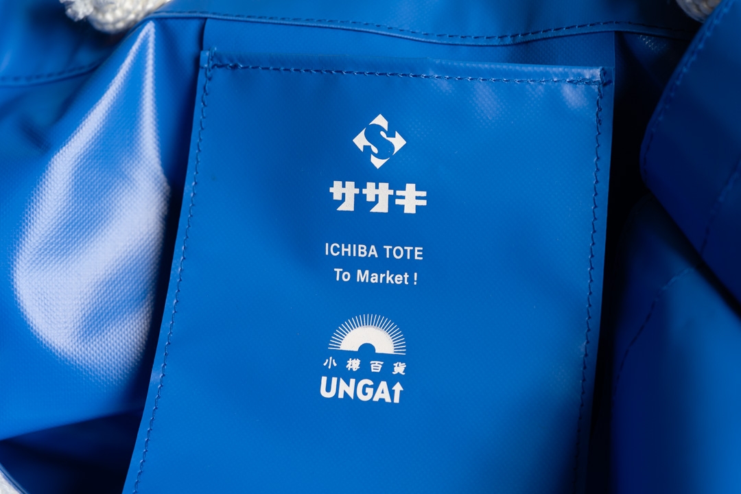 小樽には今、中央市場、中央卸売市場、三角市場、鱗友市場、南樽市場、新南樽市場という6つの市場があります。ここ数年で入船市場、手宮市場、妙見市場と立て続けに姿を消してしまいました。小樽にはいつまでも市場文化が残って欲しいと願い、1945年創業のテント工場「株式会社ササキ」の長年培った縫製技術と小樽百貨UNGA↑の市場への想いが一つになり、「ICHIBA TOTE」が完成しました。テントなどの屋外施工に使う丈夫なターポリン生地を使った「ICHIBA TOTE」を片手に、さあ市場へ出かけよう!