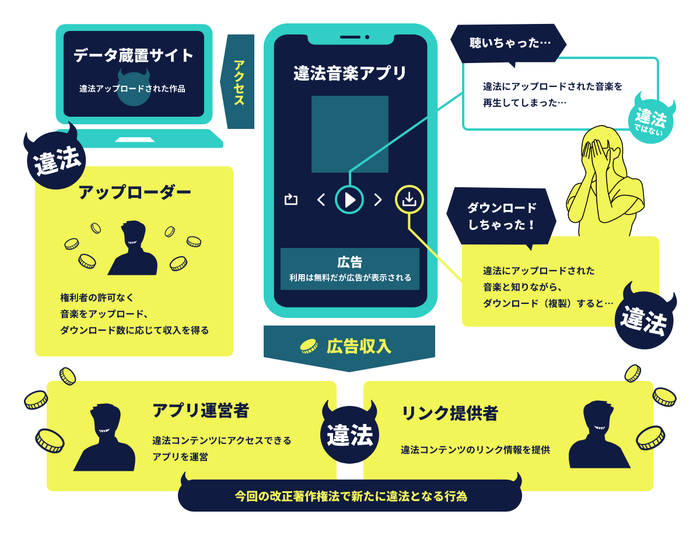 今回の法改正により、権利者に無断でインターネット上にアップロードされたコンテンツ(侵害コンテンツ)にユーザーを誘導する違法音楽アプリを提供する行為等について、刑事罰が設けられる等の措置が講じられることとなります。かねてより日本レコード協会が音楽関係団体・音楽配信サービス事業者とともに行ってきた違法対策につきましても、これまで以上に強化することが可能となりました。