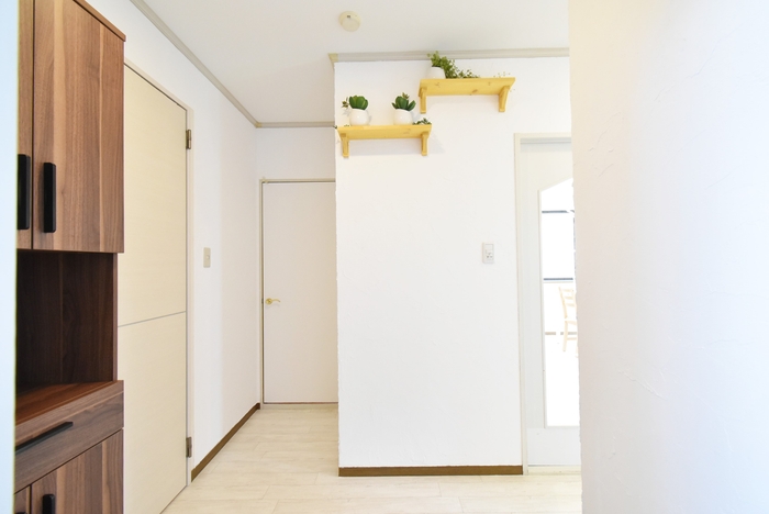 当物件が手掛ける「ナチュラルテイスト賃貸」は、できる限り室内空間に「自然素材の材料」を取入れることに注視しています。今回も漆喰をLDK・和室・洋室の全ての部屋の「壁」に施工していますが、こちらのS101号室に関しては、グレイスロイヤル初の「玄関エントランス全て」に漆喰を施工しています。