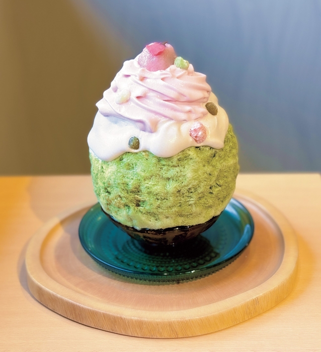 緑茶シロップに桜餅エスプーマを合わせたかき氷。