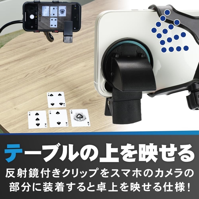 付属の反射鏡付きクリップをスマホのカメラレンズに装着することで、卓上の映像を共有できる仕組みです。トレーディングカード・トランプ・ボードゲームといった対戦ゲームにピッタリ!対戦相手に状況を伝えながらゲームを進められるだけでなく、カードの配置や動きもリアルタイムで見せることができます。