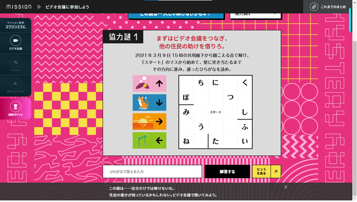 本作の舞台は、とあるマンション。プレイヤーは住民として、マンション内で起きた殺人事件の解決を目指します。容疑者は、同じマンションに住む一癖も二癖もある住民たち。今話している相手が黒幕かもしれないという緊張感の中、ビデオ会議を通じて住民たちと協力し、黒幕が仕掛けた謎を解いていきます。謎を解いていく中で次々暴かれていく住民たちの秘密。少しずつ明らかになる黒幕の陰謀。そして衝撃の真実。その全てはプレイヤーの手に委ねられます。