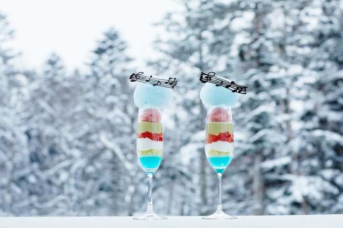 ピアノを設置したホタルストリート内のcafe&bar「つきの」では、3月1日よりオリジナルパフェの提供を開始します。パフェグラスに桃のジュレやピスタチオクリーム、トマム牛乳(*)を使用したヨーグルトクリームなど、旅するLovePianoの色合いをイメージして、層を重ねたパフェです。その上にはゲレンデにある雪玉をイメージした綿あめと五線譜と音符をかたどったチョコレートをあしらいます。濃厚なヨーグルトクリームの甘味とパフェの中に隠された口の中で弾けるキャンディーの食感を一緒に楽しめる一品です。