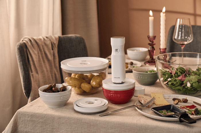 2021年ツヴィリングから真空保存機「フレッシュ&セーブ」がデビュー。専用のバッグやコンテナに食材を入れて、真空&冷蔵保存をすると、鮮度が最大5倍長持ち!フードロス、真空調理、冷蔵庫の中の整理整頓といった、たくさんのニーズに応えます。続いて2023年には常温保存に最適な「フレッシュ&セーブ CUBE」が登場。真空保存のチカラで、食品を劣化させる湿気や酸化、虫を強力にシャットアウト。開けたての風味、栄養、食感をしっかりキープ!最後までしっかり食べ切るサステナブルな食生活と美しいキッチン収納をサポートします。