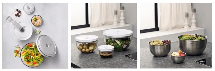 このフレッシュ&セーブに新たに仲間入りしたのが「フレッシュ&セーブ 真空保存ボウル」。下ごしらえや、和えもの、混ぜ物、保存など、キッチンに欠かせないアイテムであるボウルに真空保存機能が備わることで、下ごしらえからテーブルへのサービング、真空保存までがボウルひとつで完結!