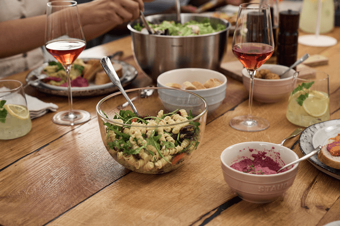 ボウルで和えたサラダなどをお皿に移し替えずにそのままテーブルへ。