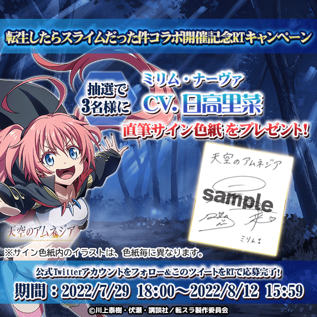 「転生したらスライムだった件」のコラボキャラクター「リムル=テンペスト」役の声優 岡咲美保さんと「ミリム・ナーヴァ」役の声優 日高里菜さんの「直筆サイン色紙」が抽選で各3名様(合計6名様)に当たるプレゼントキャンペーンを開催いたします。