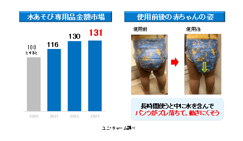 新型コロナウイルス感染症の5類移行に伴って外出機会が増加し、また猛暑などの影響もあり、お子様に「水浴び」をさせる保護者が増加しています。また、保育園や公共のプールでは、水あそび専用の紙パンツの使用を推奨しており、年々市場が拡大しています。