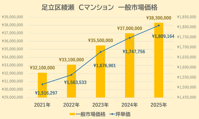 Cマンションの一般市場価格・坪単価の推移は上記【図5】の通りです。