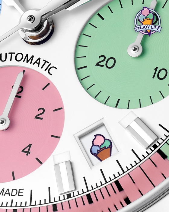 「“Enjoy Life”スペシャルエディションは、誰の中にもいる“子ども心”へのオマージュでもあります。デイト表示の小さなアイスクリームは、ただの遊び心のあるデザインではなく、“もっと肩の力を抜いて人生を楽しもう”というメッセージなのです。子どもの頃の記憶を呼び起こしたり、今の子どもたちの笑顔と重ねたり――この時計は、そんな“ピュアで心が弾むようなエネルギー”を、あなたの毎日に届けてくれます。」