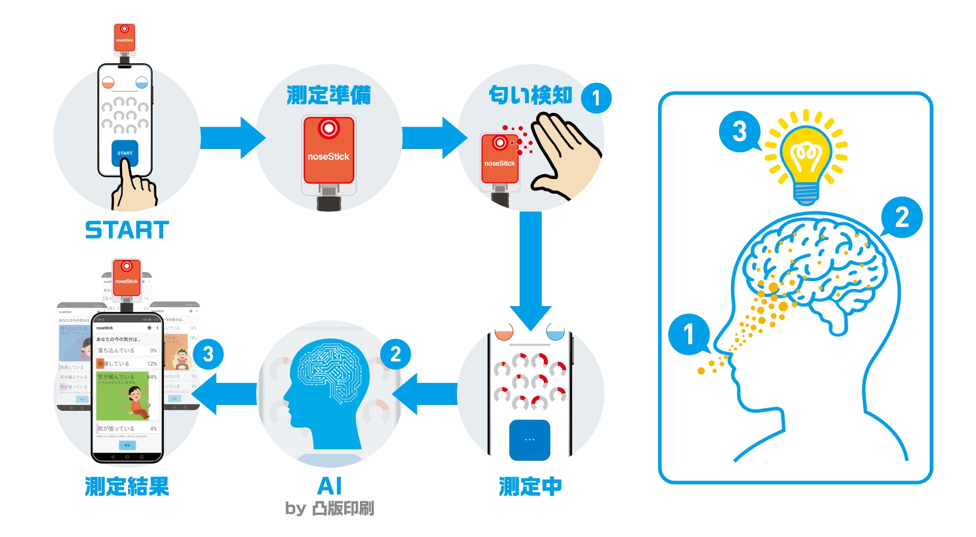 手のひらを「noseStick」にかざすことで、「高揚している」「落ち込んでいる」「気が張っている」「気が緩んでいる」の4つの気分の割合を分析。人間の手のひらが発する物質はその時々の状態や感情によって変化することから、「noseStick」での検知とAIによる分析を組み合わせることで、手をかざした人の「御機嫌」として表示します。