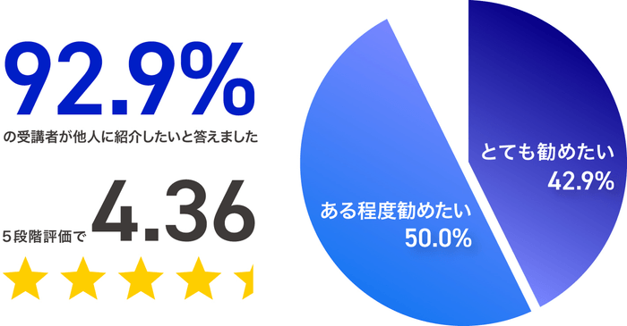 受講者の中で「この講座を他の人に紹介したい」と答えた人は約93%と、非常に高い満足度と評価をいただいています。