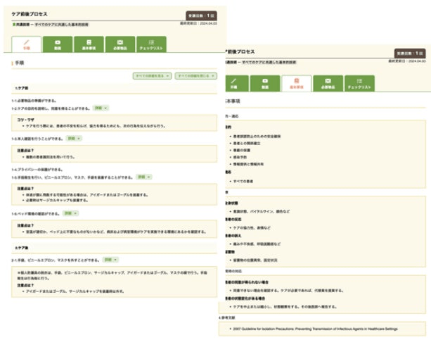 技術の進歩とともに目まぐるしく変化する医療と看護に対応できるように、技術映像、講義等を最新情報に常に更新します。より効果的な学習と実践を考えて、複数の視点から確認が必要な看護技術について360度好きな角度で確認できる映像を随時追加、また看護手順書と実用物品を集約したビジュアルポケットブックの提供等、臨床の現場に役に立つコンテンツを提供していきます。