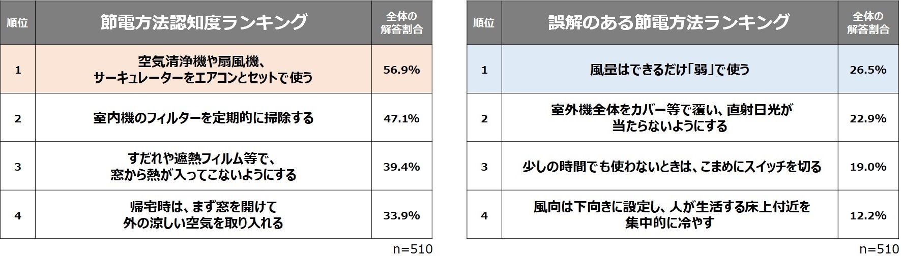 今回の選択肢のうち、効果的な節電方法として最も知られていたのは「空気清浄機や扇風機、サーキュレーターをエアコンとセットで使う」(56.9%)でした。一方、逆効果になりかねないにもかかわらず、節電効果が期待できる方法として最も票を集めたのは「風量はできるだけ『弱』で使う」(26.5%)でした。