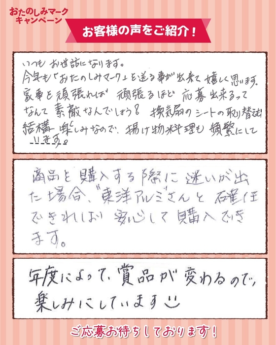 毎月、多くのお客様からキャンペーン応募はがきに寄せられるコメントは、当社にとって貴重なご意見です。これらの「お客様の声」は、商品の改良や新商品の開発に活かしております。