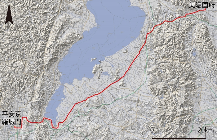 古代の人が、どんなところをどのくらいの時間をかけて移動していたのか、それを知りたくて研究を続けています。『延喜式』という平安時代の法律文書には、日本各地から平安京までの往復の日数が書いてある部分があります。この数字の意味については諸説あり、必ずしも実態を表している数字では無さそうだということが分かっていますが、実際はどうでしょうか?そこで、研究の一環として現地を歩いてみることにしました。条件を考えた結果、発掘調査などが進んでいてルートが比較的解明されている東山道を選び、平安京と美濃国府(岐阜県不破郡垂井町)の間、約100kmを往復歩いてみました(図1)。