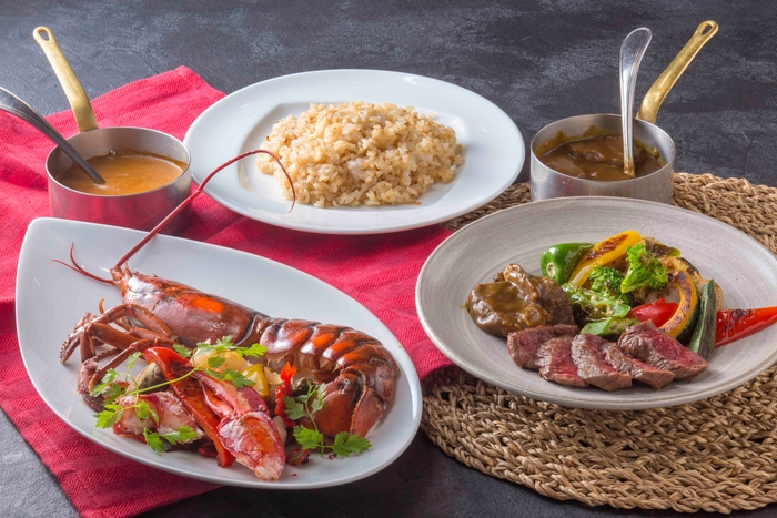 オマール海老のフォン(だし)で仕上げたカレールーにオマール海老と野菜の鉄板焼を添えました