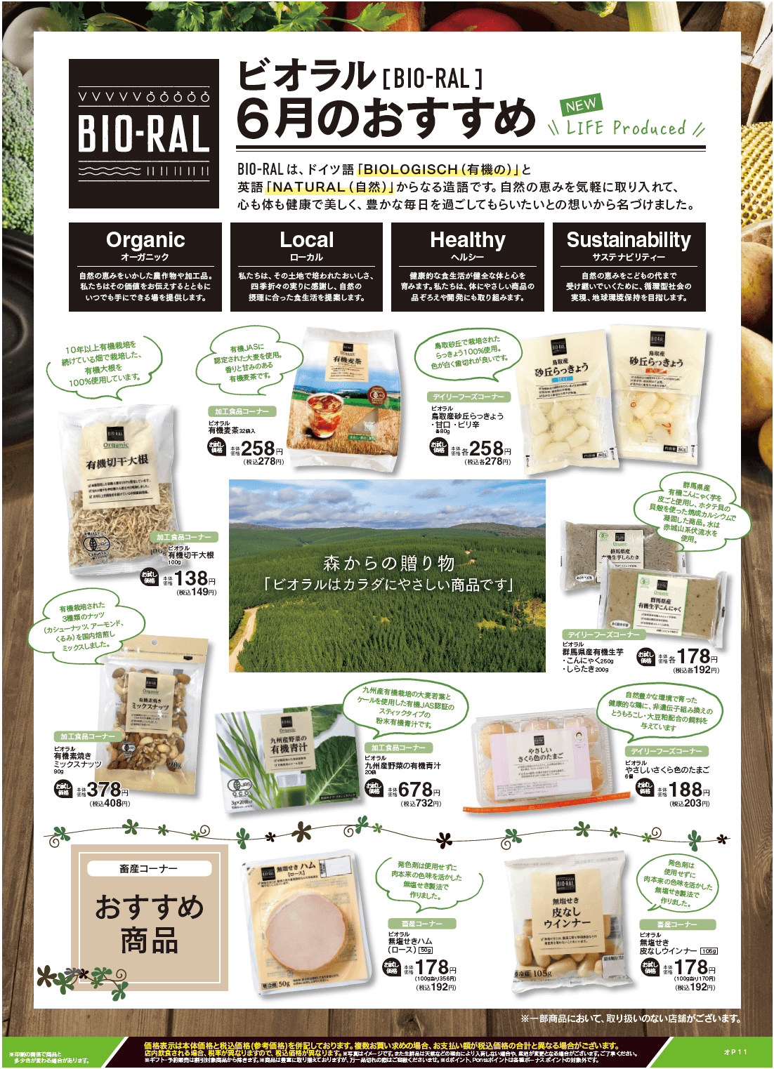 “おいしい” “ワクワク” “ハッピー” をお届けするライフコーポレーションは、健康志向のお客様におすすめしたいBIO-RAL(ビオラル)商品を、毎月お試し価格にて販売いたします。6月のおすすめは11品。第1弾は「群馬県産有機生芋しらたき・こんにゃく」「やさしいさくら色のたまご」「鳥取産砂丘らっきょう」をご紹介いたします。
