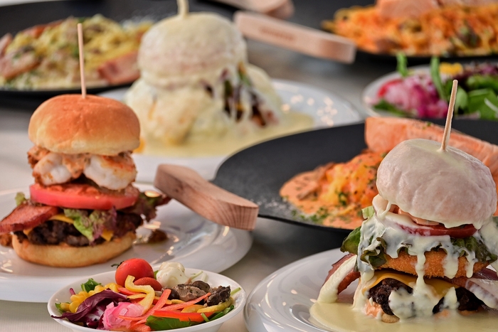 1階のシーフードダイナーでは、人気メニューに待望の新作が期間限定で登場。つなぎを一切使用せずミート100%のジューシーなパティを使用した「DINER’S HAMBURGER」には、既存の5種類に加え、ガーリックシュリンプハンバーガーとビッグオムエッグバーガー、クリスピーポテトバーガーの3種類を新たに提供いたします。また、濃厚なトマトやポルチーニのクリームソースを味わえる2種類のパスタや、厚切りのサーモンやハンバーグがトッピングされた2種類のオムライスなど、食欲をそそるメニューをご用意しました。