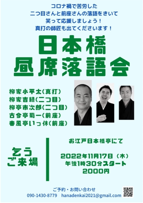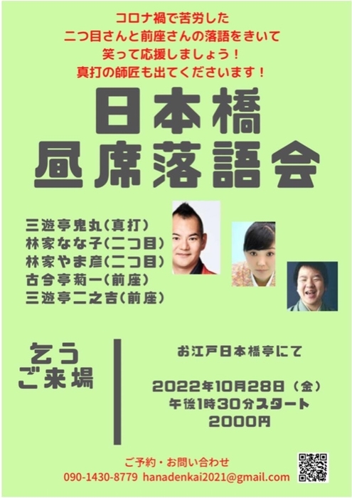 二つ目さんや前座さんの落語を聴いて笑って応援 『日本橋昼席落語会』9月~12月 出演者決定 カンフェティでチケット発売