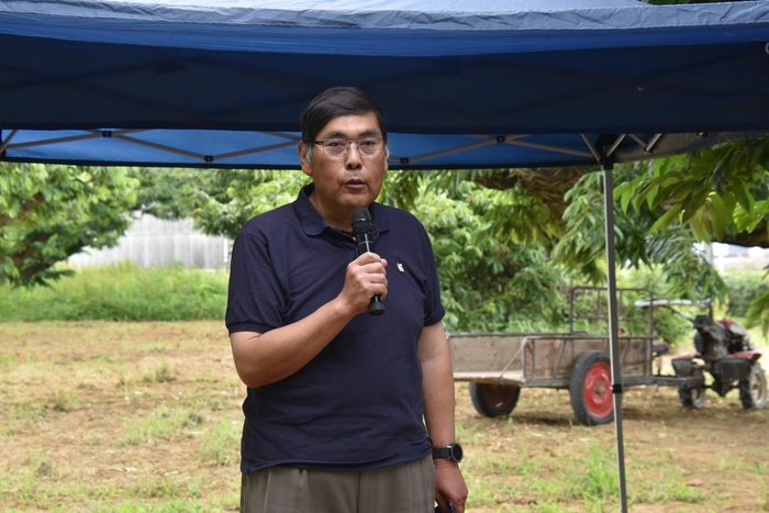 作業の前に、氏田稔農学部長、小原章裕専務理事、附属農場長の林利哉教授が「今、備蓄米のニュースが盛んに報じられているが、農学部で学ぶ私たちは米はどう保存し、どうスーパーに並び、どう値段がつけられるのかを考えたり、調べたりするきっかけにしてほしい」などとあいさつ。熱中症への注意も呼びかけられました。