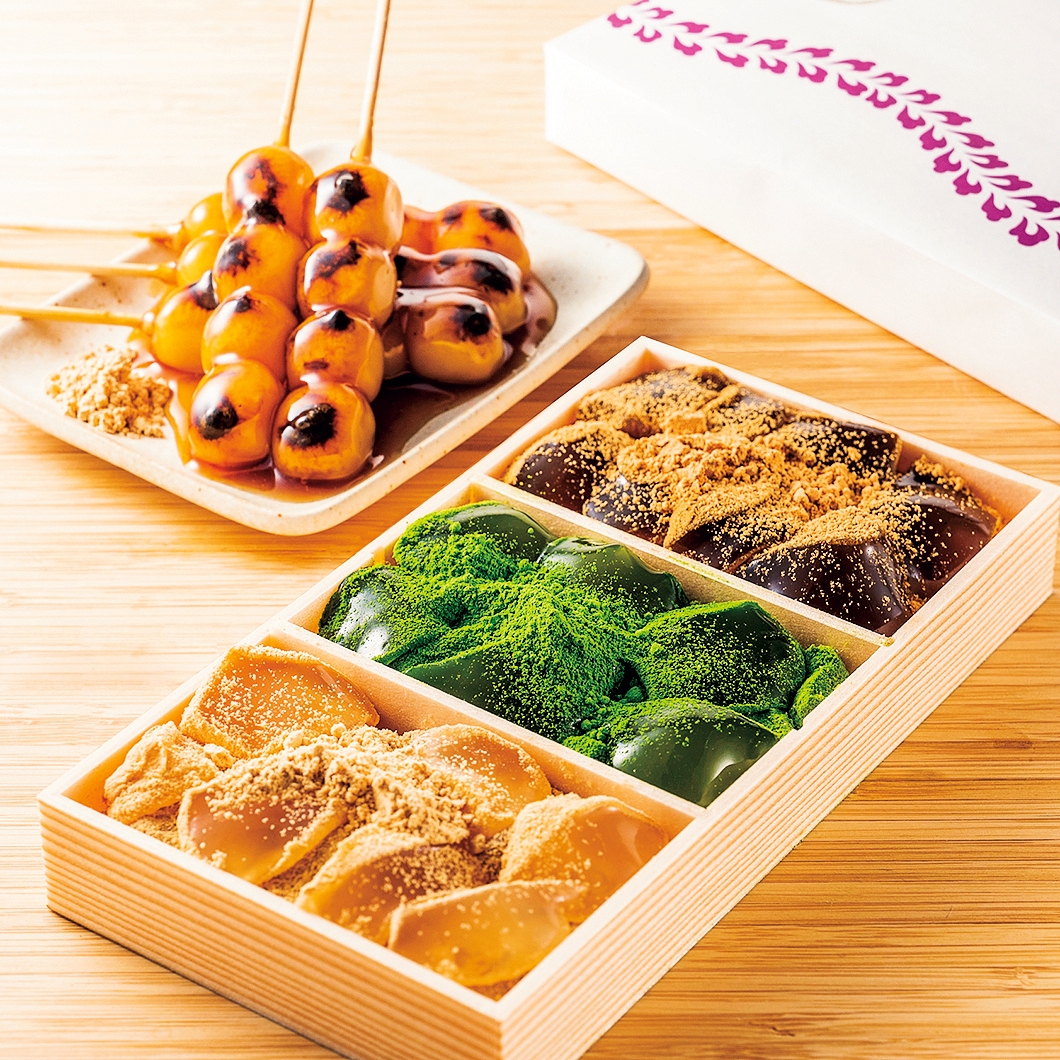 国産大豆の皮むききな粉、宇治抹茶、波照間の黒糖3種類それぞれが味わい深い逸品。本わらび粉を使用したなめらかで優しいくちどけ。