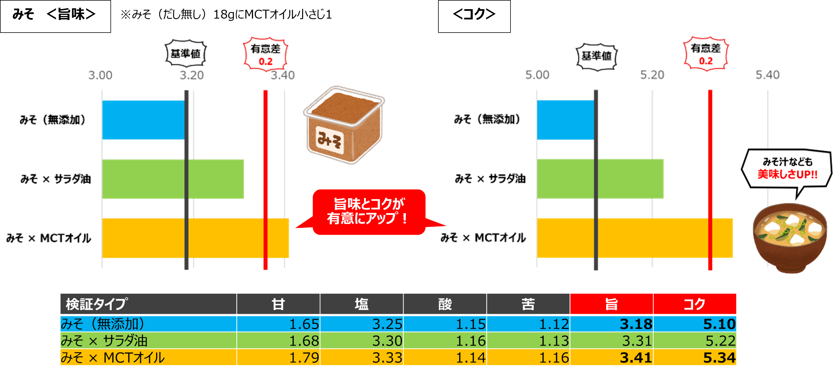 その結果、検証した全ての食材でMCTオイルを加えることによる有意差が確認されました※5。いずれもコクや旨味がアップすることで「美味しさ」に寄与しているほか、ヨーグルトの酸味や温野菜の苦味を低減させる効果が見られたため、より食べやすくなると言えるでしょう。以上のことから「MCTオイル」は、無味無臭なため日常の食事にプラスしやすく、様々な食事の美味しさを高めることが期待できると示唆されます。