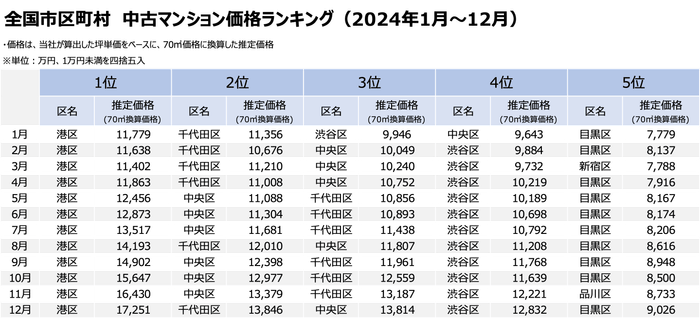 「不動産×WEB×ビッグデータ」の領域で、さまざまな不動産テックサービスを展開する株式会社ワンノブアカインド(本社:東京都港区、代表取締役社長:川島 直也、以下当社)は、当社が運営するマンション情報サイト「マンションレビュー」の保有データを元に、2024年の東京都の上位5区※1の中古マンションの相場を調査。毎月プレスリリースで発表している全国の中古マンション価格※2のランキング・相場推移について、2024年の発表内容を振りかえり、注目トピックを調査。