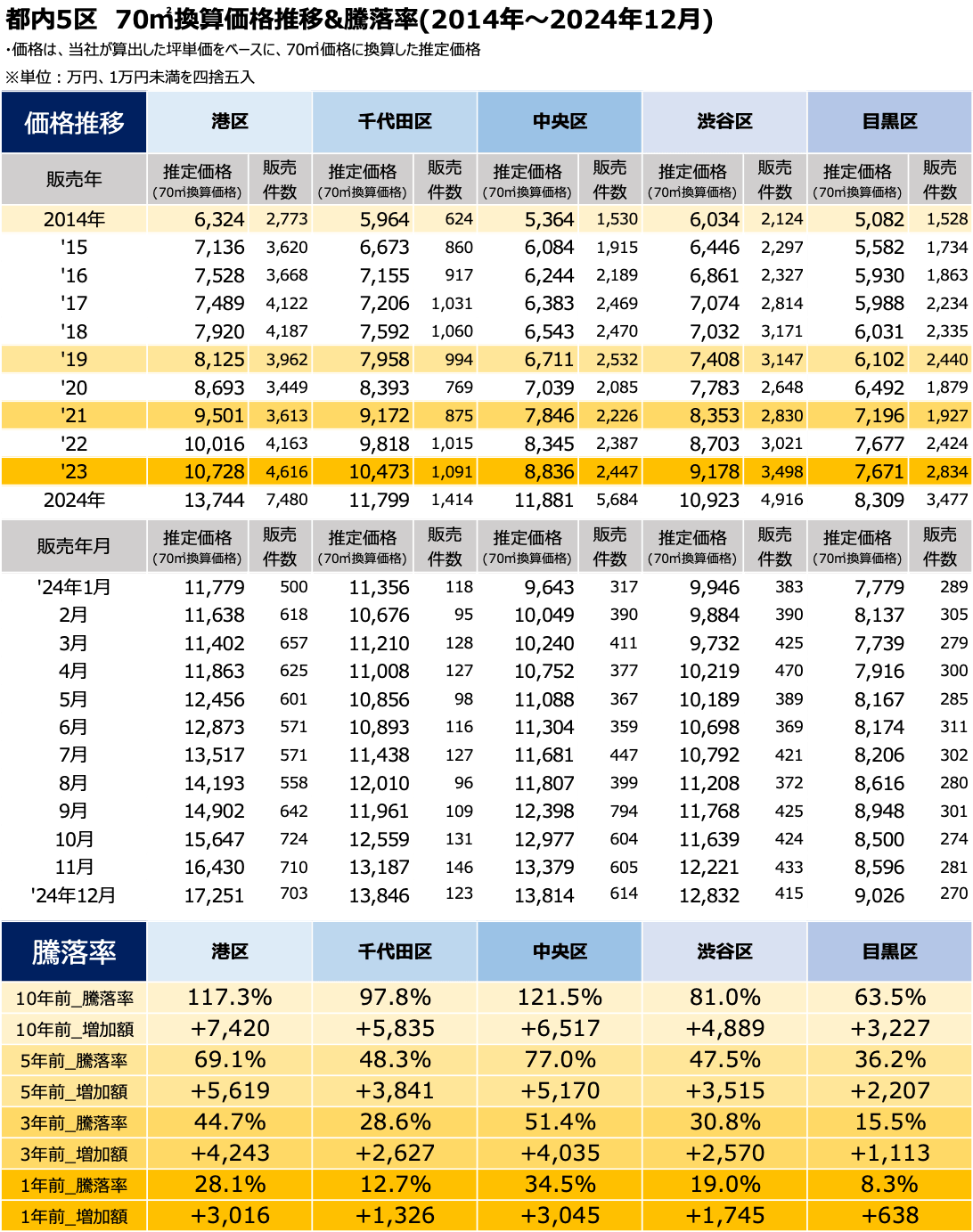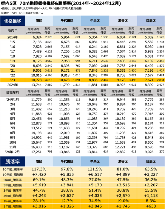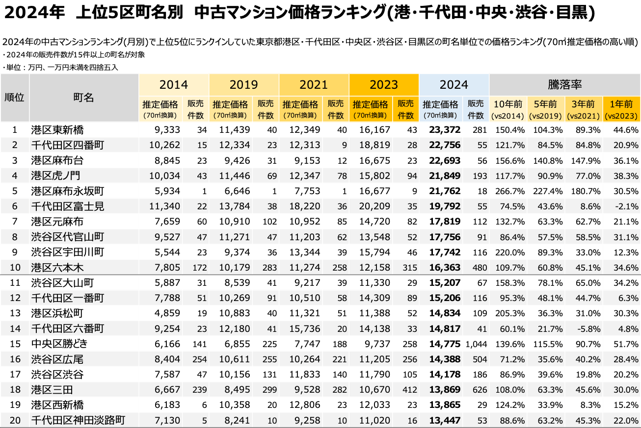 その第1弾として、2024年中古マンション価格ランキングにおいて、年間を通じて上位5位であった東京都港区・千代田区・中央区・目黒区・渋谷区の5区について深掘りし、10・5・3・1年前からの推移と町名単位での中古マンション価格推移を発表いたします。