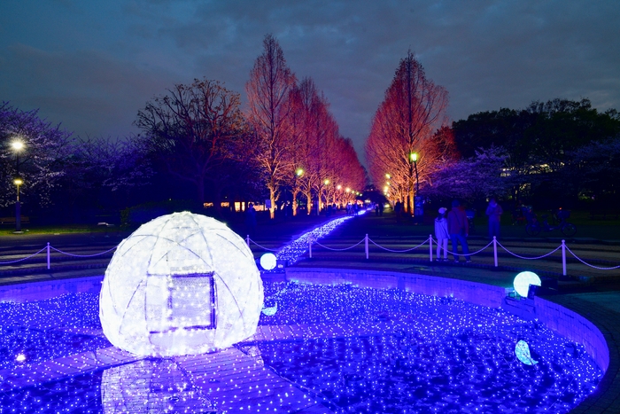 昨年に引き続き、今年も芝生広場に広大なネモフィラ花壇を創出し、まるで海のような美しい青色の花々をお楽しみいただけます。夜はストリングスライトを活用した波打つ光の演出で幻想的なライトアップが行われ、「TONERI」のモニュメントにはプロジェクションマッピングも!昼も夜も楽しめる春ならではの景色は必見です。都心で広大なネモフィラ花壇が楽しめる舎人公園にぜひご来園ください!