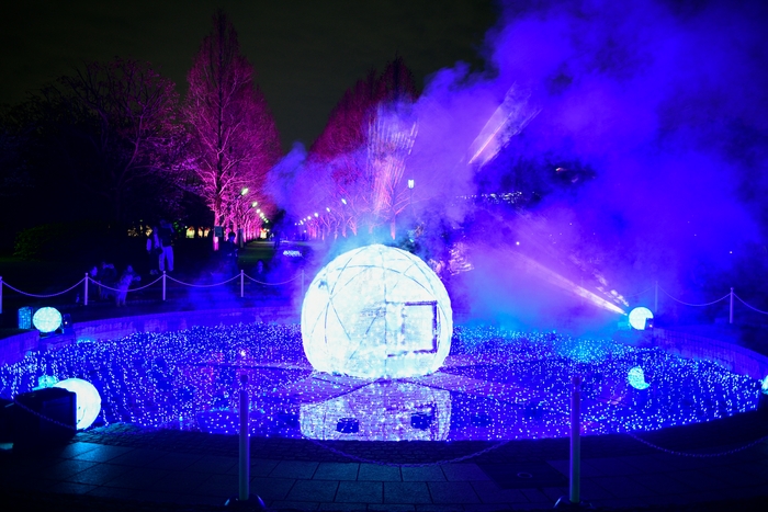 公園入口(舎人公園駅東口)からネモフィラ花壇までの導線にある噴水や流れは、青色の光でまるで水が流れているかのような演出を行い、ネモフィラ花壇はストリングスライトを活用して、花壇全体が青色から白色に変化し、波打つ光に包まれるような演出を行います。「TONERI」ロゴのフォトスポットは、夜間は音楽に合わせたプロジェクションマッピングで照らします。