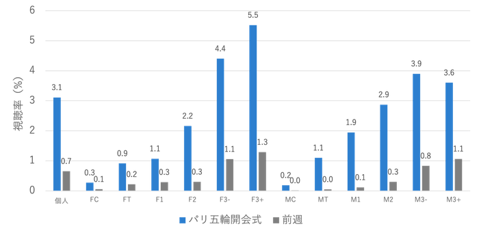 全ての性年代で前週の視聴率を大きく上回り、中でもF3+の視聴率が最も高く5.5%となりました。また、若年層(FT, F1, F2, MT, M1, M2)は前週時点では0.5%未満という非常に低い視聴率だったにも関わらず、今回1〜3%程度の視聴率となっており、オリンピックが幅広い年齢層に訴求できるコンテンツであることが伺えます。