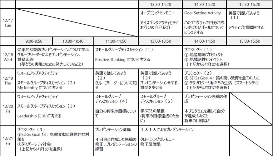このプログラムでは、会話は原則すべて英語とし、ディスカッションやアクティビティを通して英語運用能力を高めるとともに、多様な文化や価値観、考え方に触れ、国際的な視野を身につけることをめざします。