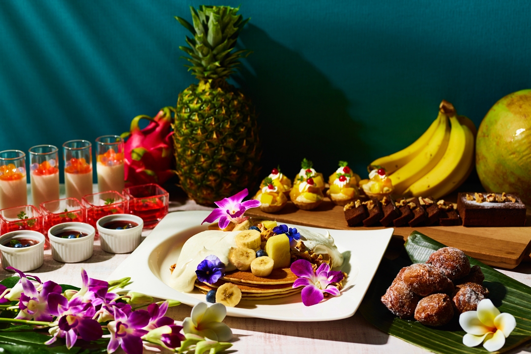 【デザート】ココナッツプリン、ハワイアンフルーツパンケーキ、クルミのチョコレートブラウニー、アセロラゼリー、ヨーグルトムース アサイソース、他