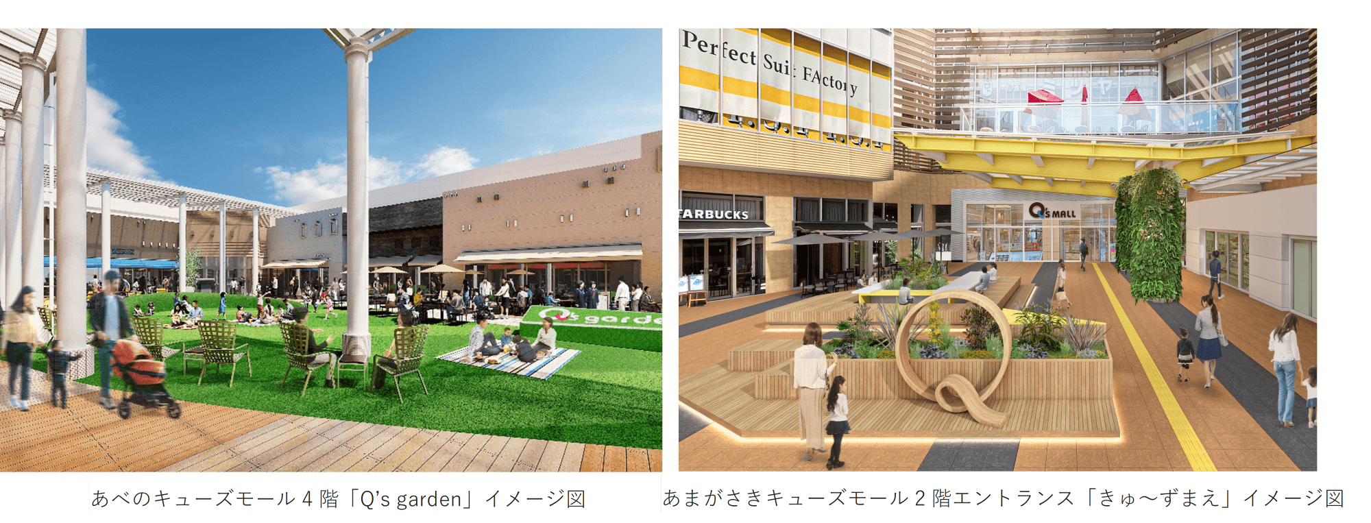 また、大阪3大ターミナルに位置するあべのキューズモールの4階屋外空間に「Q’s garden」をオープンし、エリアにおいて希少なつどい、くつろげる庭が誕生します。あまがさきキューズモールの2階エントランスでは、施設の顔となり、待ち合わせスポットにも最適な「きゅ~ずまえ」が誕生し、よりくつろぎを感じられる心地よい施設へと進化します。