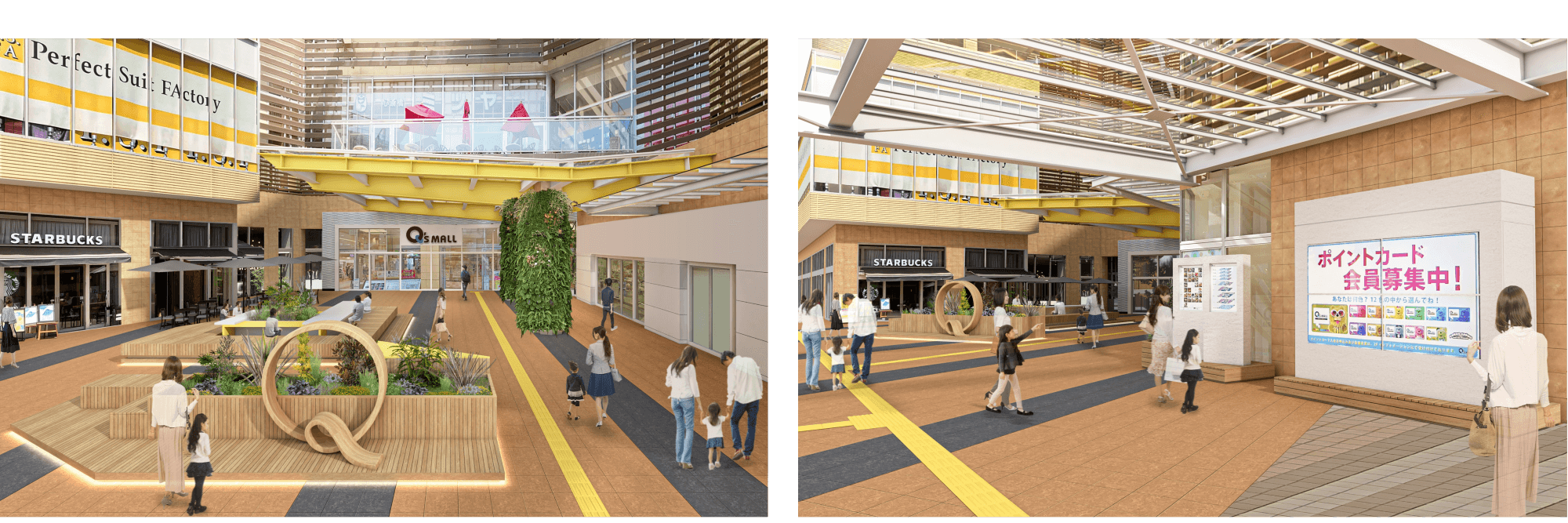 2024年4月に、JR尼崎駅からデッキで直結している2階エントランスが「きゅ~ずまえ」として新たに生まれ変わります。東急不動産ホールディングスの保全対象森林、岡山県西粟倉村の間伐材を活用して、キューズモールの頭文字”Q”の模したモニュメントを新たに設置し、お客様の印象に残るシンボリックな空間を創出します。また、ビックテーブルとベンチを配置することで、お客様同士の交流やお買い物終わりのひと休憩にも活用いただける広場となり、お買い物だけではない価値を提供し続けるあまがさきキューズモールを体現した”つどえるエントランス”をめざします。