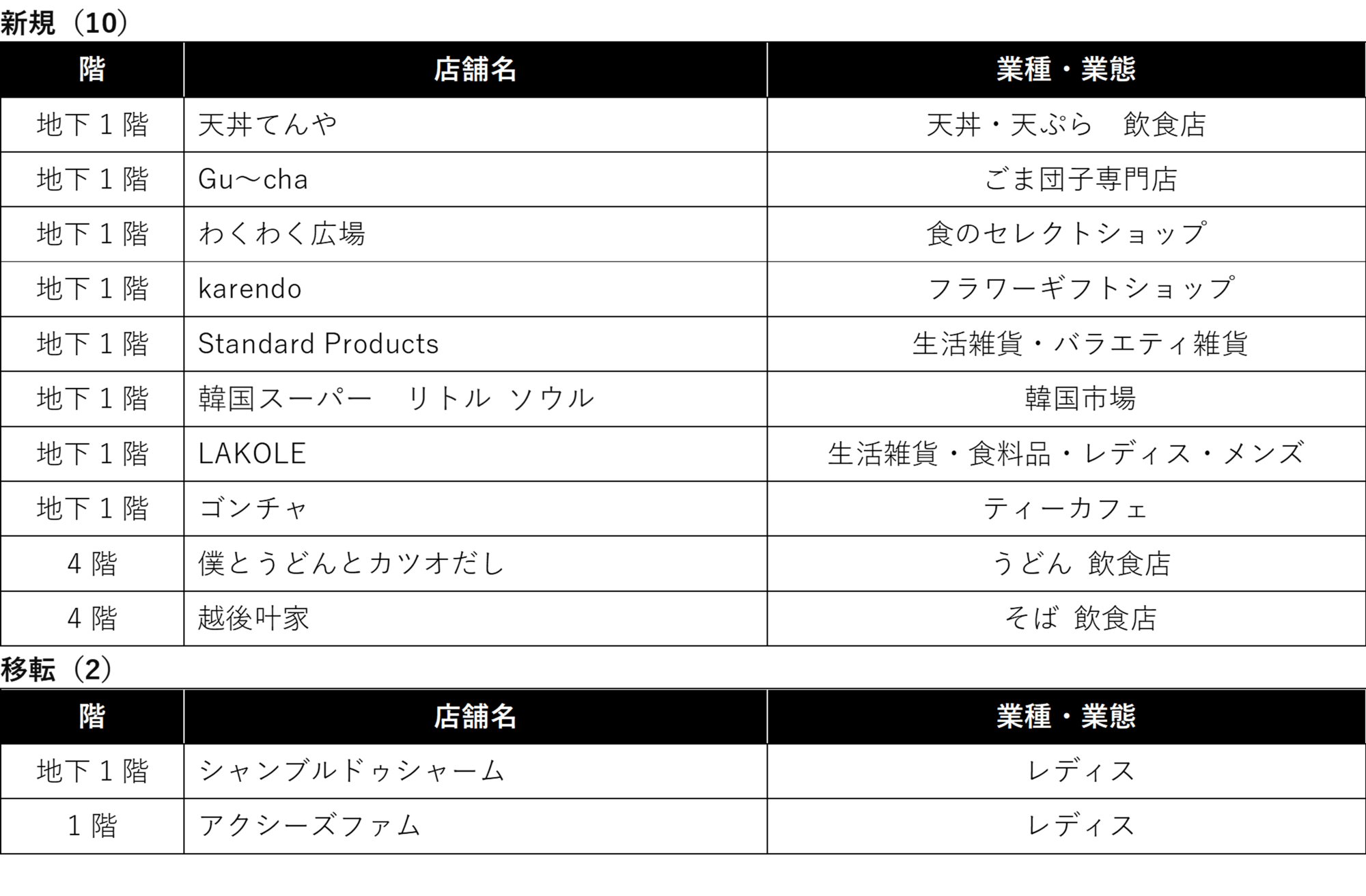 あべのキューズモールでは、新店10店舗、移転2店舗のリニューアルを実施します。地下1階では地域の生産者とお客様を結ぶ直売所「わくわく広場」や、韓国スーパーの「リトルソウル」などの食関連店舗や、「Standard Products」や「LAKOLE」などの生活雑貨店舗が新たにオープンし、さらに皆様の「食」や「日常」を支えるフロアとなります。