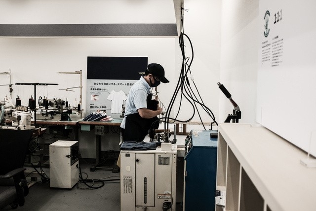 これまでパンツの縫製30年、さらにウエディングドレスからスポーツウェアまであらゆる縫製を手掛け、業界で高い技術と実績を持つ開発担当の阪西。
