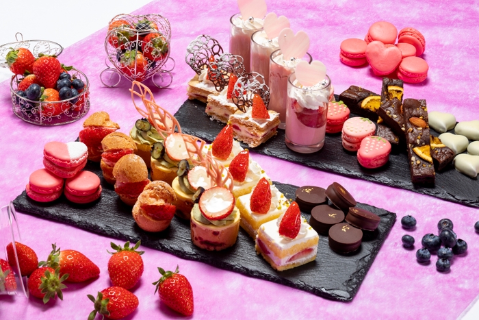 キュートなイチゴ型やハート型の『マカロン』、サクサクのパイ生地とイチゴの層が織りなす隠し味のホワイトチョコが決め手の『ミルフィーユ』。美らイチゴのジュレをサンドしたオリジナルフレジエ風ケーキの『ガトーフレーズ』。