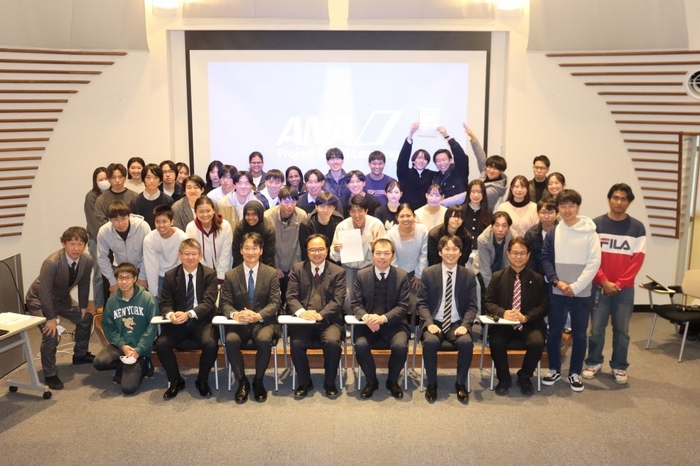 この日のプレゼンは、12月3日にANA側から提示された①航空業界の脱炭素化に向けた新技術導入の課題と解決策を議論②フライトの「待ち時間」を「価値ある時間」に変える提案③ヒューマンエラーを最小化する取り組みを提案――という3つのテーマに基づいて、参加した46人の学生(1~4年生、大学院生)が9チームに分かれ、メンバーが役割分担して練り上げました。