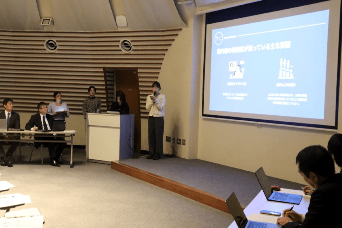 企業賞を受賞した1チームは経営学科4年、前田陽大(はると)さんら5人。テーマは「『待ち時間』を『価値ある』時間に」で、空港内書店兼図書館の設置を提案しました。「ビジネスパーソンの時間の課題」と「実際に本を手に取りたいニーズ」、「書店減少の課題」「書店の体験型価値」を融合させたアイデアで、空港内の待ち時間に本を選び、機内で読み、到着先の空港で返却するか購入するというプランです。