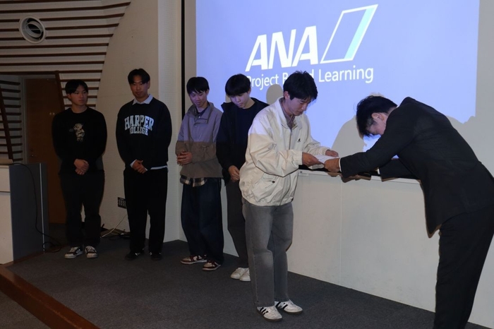 審査終了後、細見マネジャーは「我々の期待を超える本当に面白い提案ばかりでした。どれも甲乙つけがたかったと思います。いろいろな切り口がありました。その中でANAにとってプラス、企業価値が高まるような視点で、まさにそこをきちっと切り取った提案に企業賞を贈ることにしました」と受賞理由を説明し、表彰状を手渡しました。