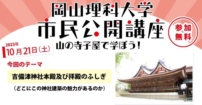 【岡山理科大学市民公開講座】吉備津神社本殿及び拝殿のふしぎ(どこにこの神社建築の魅力があるのか)|日時:2023年10月21日(土)13:30~15:00 開催!参加無料