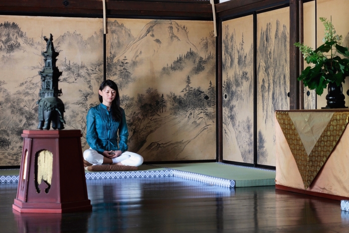 禅寺にて、朝のお勤めを体験します。姿勢を正して坐禅を組み、和尚様とともにお経を唱えます。早朝の澄み切った空気を取り入れ大きな声で発声することで、気持ちよく一日を始めることができます。その後、和尚様が点てた抹茶を飲みながら法話を聞きます。朝のお勤めは、姿勢や呼吸を調えるだけではなく心を調えることにもつながります。