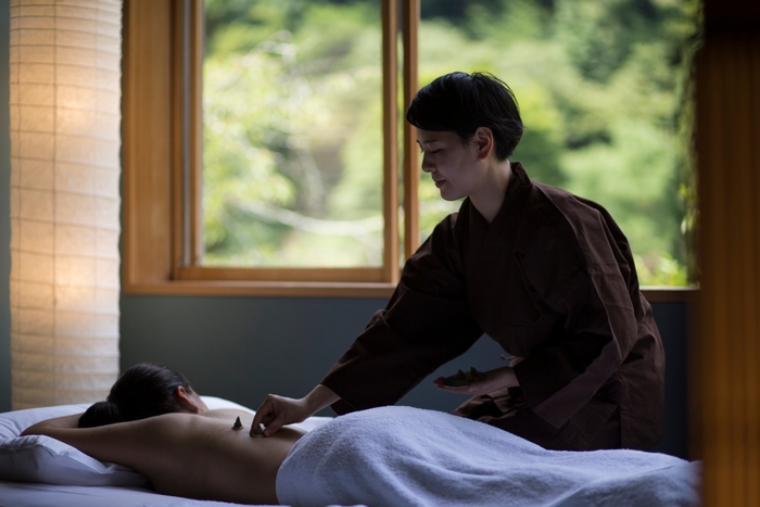 星のや京都では、東洋医学の考えに基づいた施術を行います。客室にて施術師が問診を行い、お灸を据えた後、草根木皮の湯とお茶で身体を整えます。湯とお茶は問診結果をもとに一人ひとりの身体の状態に合わせて用意したもので、免疫力向上に大切な呼吸機能を整える処方です。また、家に帰ってからも健やかに過ごせるよう施術師が、お灸の据え方や入浴法、お茶を飲むタイミングもレクチャーします。