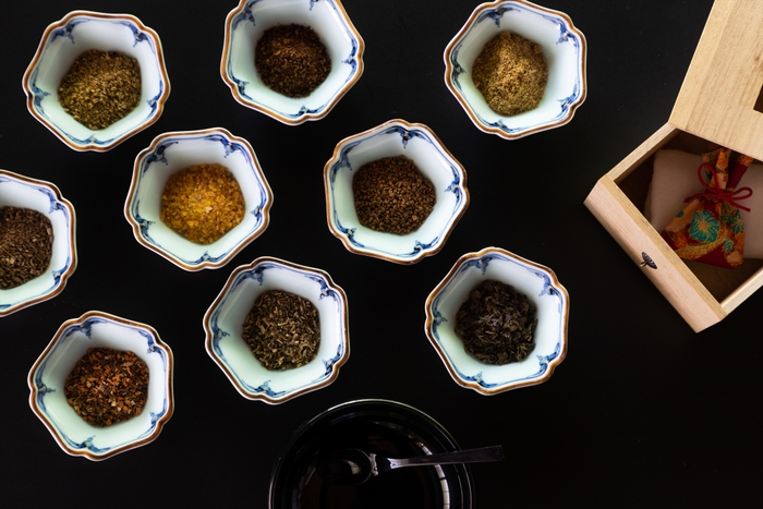 京都の老舗香木店「山田松香木店」にて、匂い香づくりの体験をします。お香の原料となる天然香料の中には薬種として漢方に使われるものが多数あり、本プログラムでは一人ひとりの体質に合わせた香原料を用意しています。自分好みに香原料をブレンドし西陣織の小袋につめて匂い香をつくることで、京都の文化を体験しながら香りで心を調えることができます。