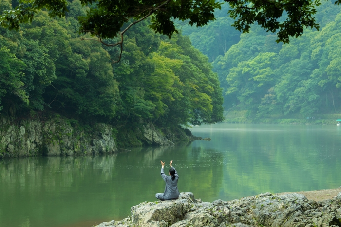 「水辺の洗心」とは、Withコロナ時代に特に重要な呼吸機能を鍛え、同時に免疫力を高める、2泊3日のウェルネスプログラムです。星のや京都が位置する嵐山は、かつて平安貴族の別荘地として栄えた場所です。庭を中心として設計された25室の客室全てが大堰川(おおいがわ)に面しており、四季の自然の移ろいを肌で感じることができます。風光明媚な星のや京都に滞在するなかで、東洋医学の考えに基づく鍼灸の施術と京都の伝統文化を体験し、心身を調えながら免疫力を高めることができます。